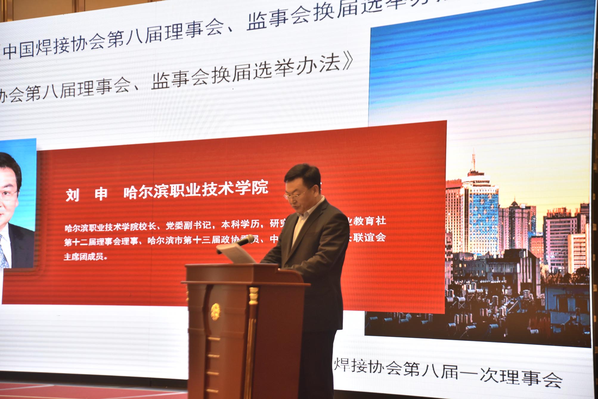 哈爾濱職業(yè)技術(shù)學(xué)院校長劉申宣讀了《中國焊接協(xié)會第八屆理事會、監(jiān)事會換屆選舉辦法》,大會對該選舉辦法沒有異議,鼓掌通過。